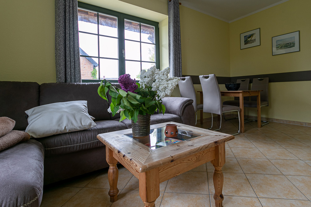 Im großen Wohnzimmer stehen eine Sitzgruppe mit Tisch und Sesseln, ein Esstisch mit Stühlen und ein Schrank mit TV – Gerät. Hier befindet sich auch die Küchenzeile mit einem Cerankochfeld, Kühlschrank, Geschirrspüler, Wasserkocher, Kaffeemaschine, Toaster und Mikrowelle. Ein kleines Kinderreisebett und ein Hochstuhl können auf Wunsch kostenlos bereit gestellt werden. Im ersten Schlafzimmer stehen ein bequemes Doppelbett mit Nachttisch und Leselampe sowie ein Kleiderschrank. Im zweiten Schlafzimmer stehen zwei Schlafliegen.